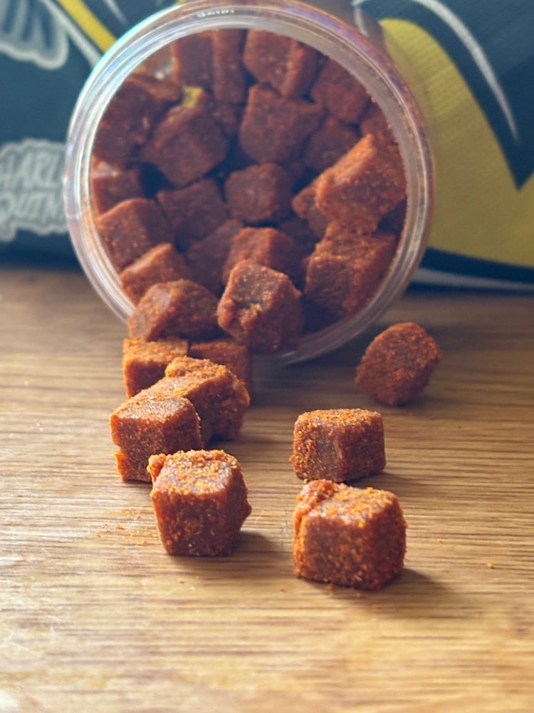 Cubed spicy curry nut boilies. Changing the dynamic from everyday round boilies, our cubed boilies are inspired from fishing with meat. Packed with lots of flavours and nutrients.